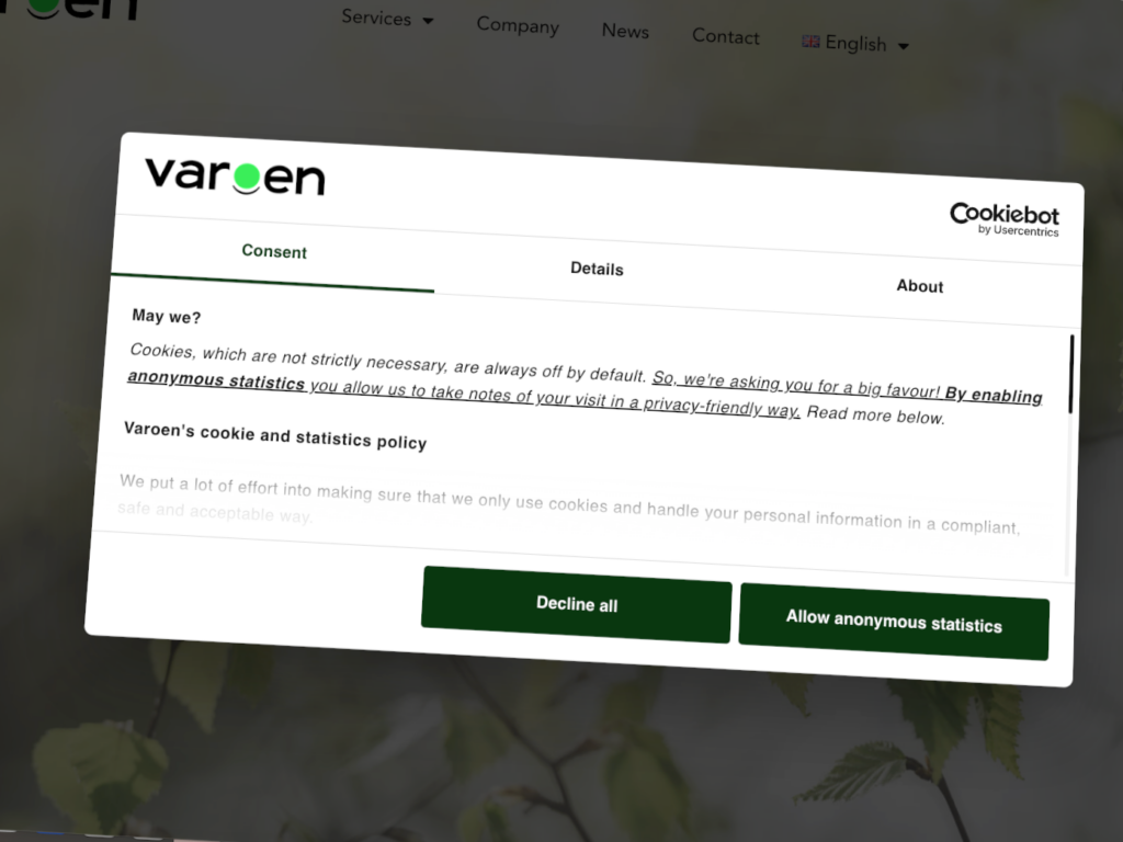 Since its inception, Varoen has always asked its website users for their consent for anonymous and cookie-free analytics.
